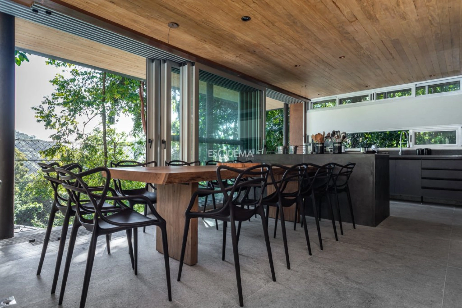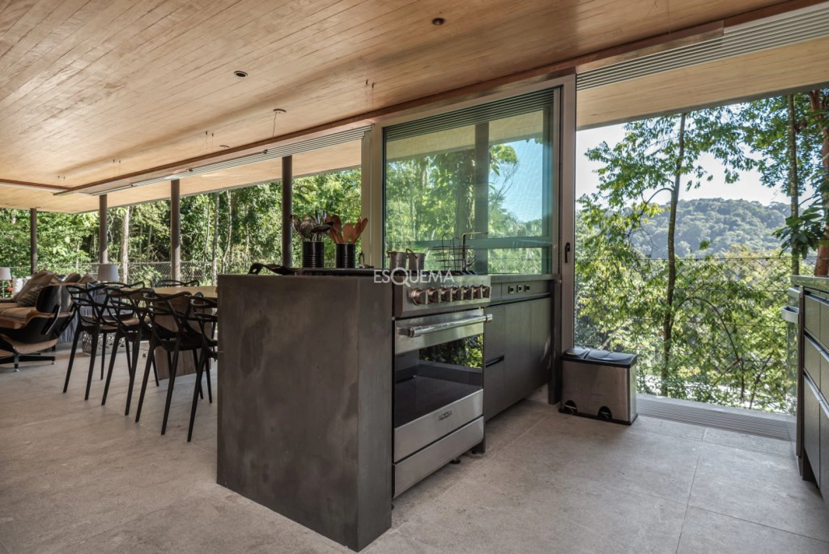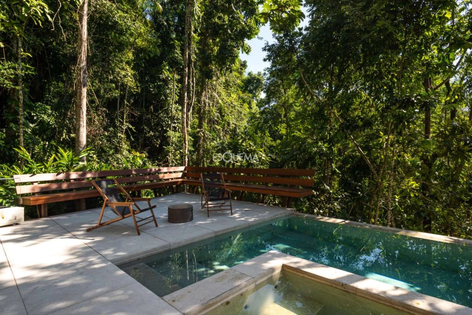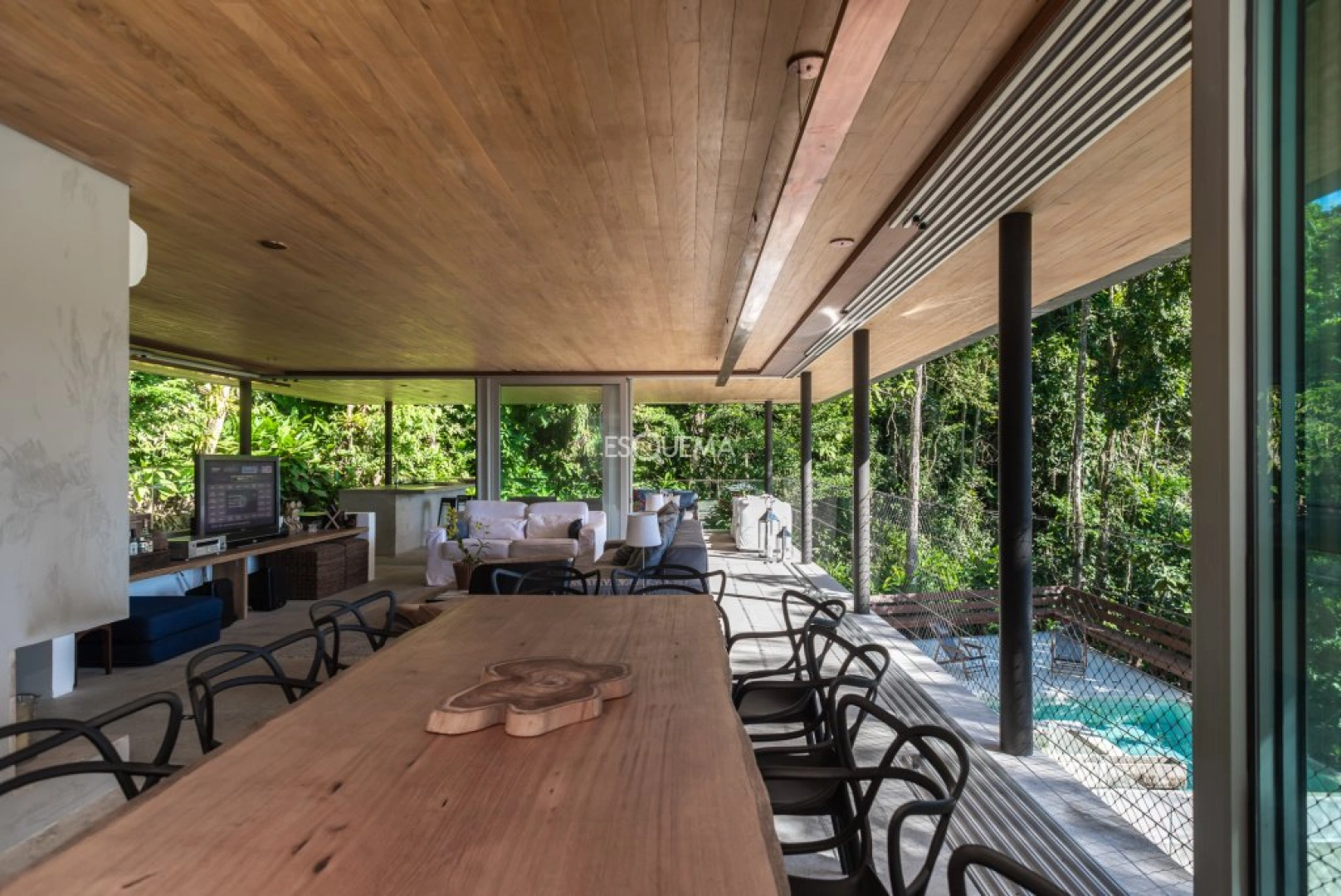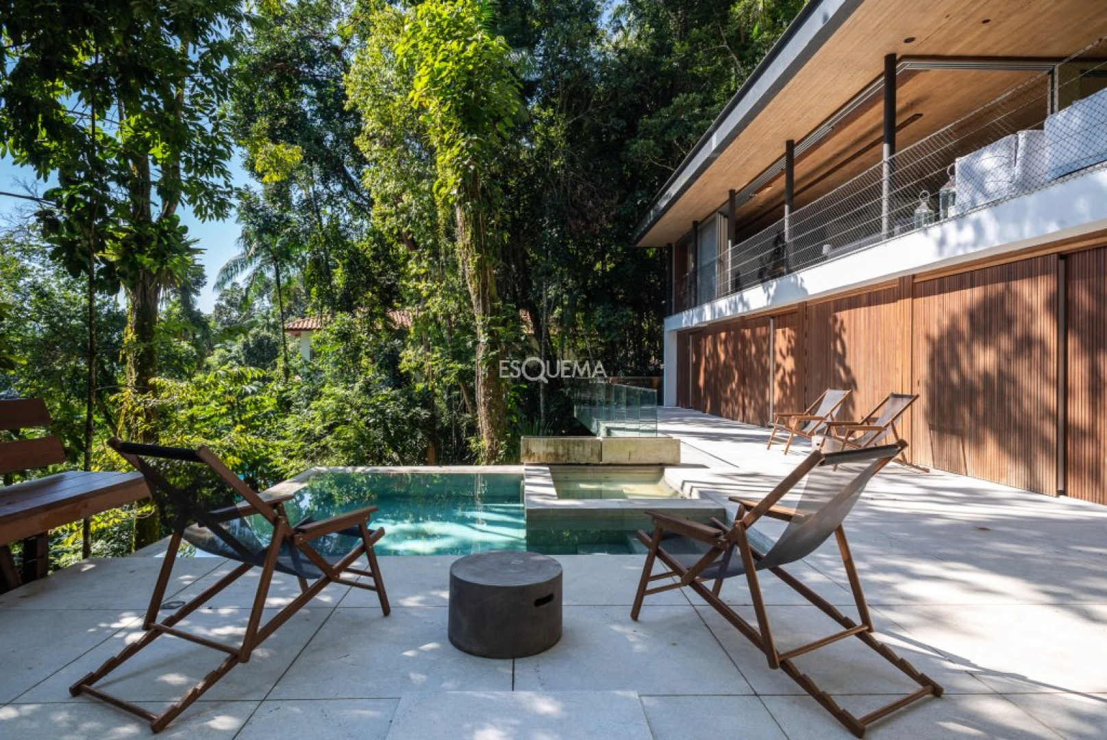 Casa moderna e rodeada por árvores, com arquitetura de Gui Mattos, na Praia de São Pedro, Guarujá. A casa se destaca pela luminosidade e espaços integrados com o meio ambiente. No primeiro andar, são 3 suítes com acesso à ampla varanda, piscina e sauna. Na parte superior, possui sala de estar com cozinha integrada e varanda com churrasqueira. Conta ainda com uma quarta suíte, com vista para o verde. O imóvel dispõe de jacuzzi. A praia de São Pedro é um dos locais mais procurados por ser próximo de São Paulo e o condomínio conta com infra estrutura completa.